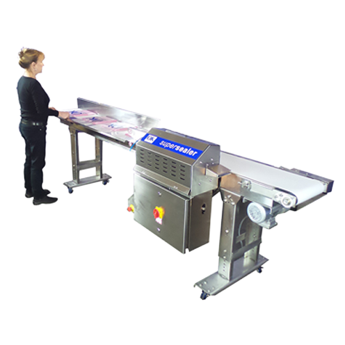 OK Sealer offers a variety of semi-automatic bagging systems that offer you a reliable and versatile bag sealing experience. The semi-automatic T-PAK 500 comes equipped with an Supersealer hot air or band sealer, a 10' long flat conveyor, optional T-PAK infeed device, SST Top Trimmer and a Trim Remover.