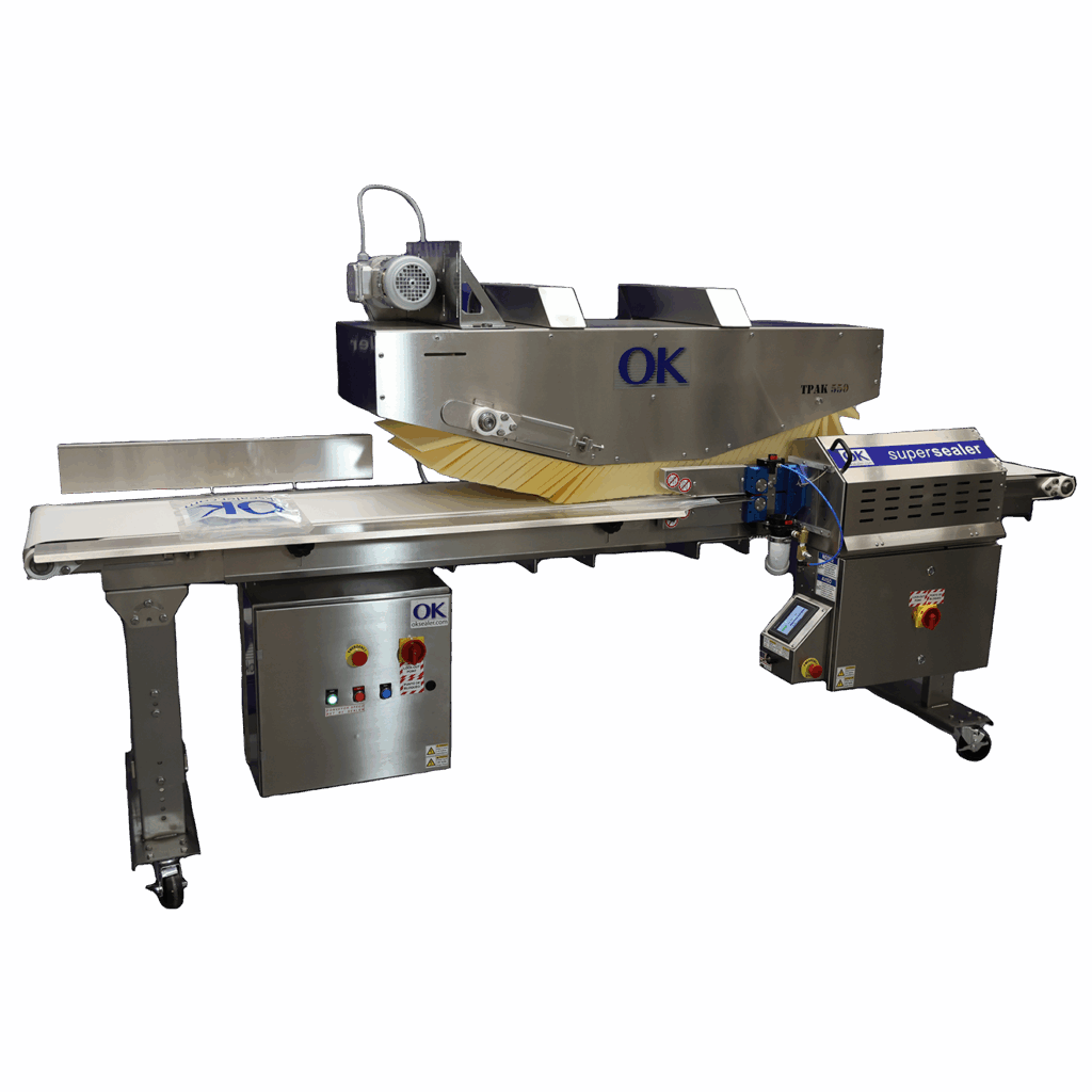 The T-PAK 550 bagging system, is equipped with a flat conveyor and a foam or blue FDA cleat compression belt. The bag with the product comes down the conveyor belt and the foam or cleat compression belt will take the air out of the bag without harming the product. The bag then enters a Supersealer hot air or Supersealer band sealer to get the “perfect seal”. This platform makes this an unchallenged heat-sealing system for many applications, superior in performance and speed with low maintenance cost.