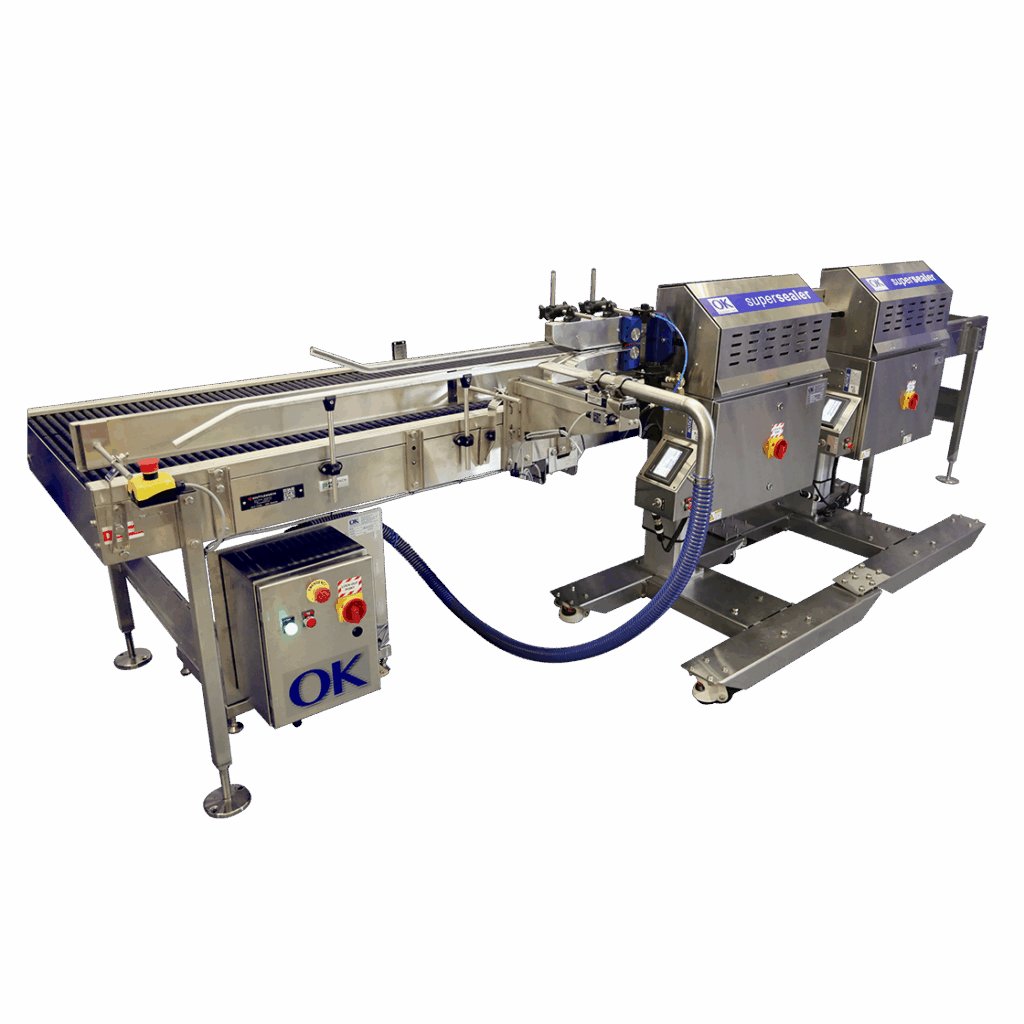 OKI has developed a continuous bag sealer with air evacuation or air evacuation and gas flush. This system is available in stainless steel, 316 stainless steel, wash down IP65 and wash down IP69K.