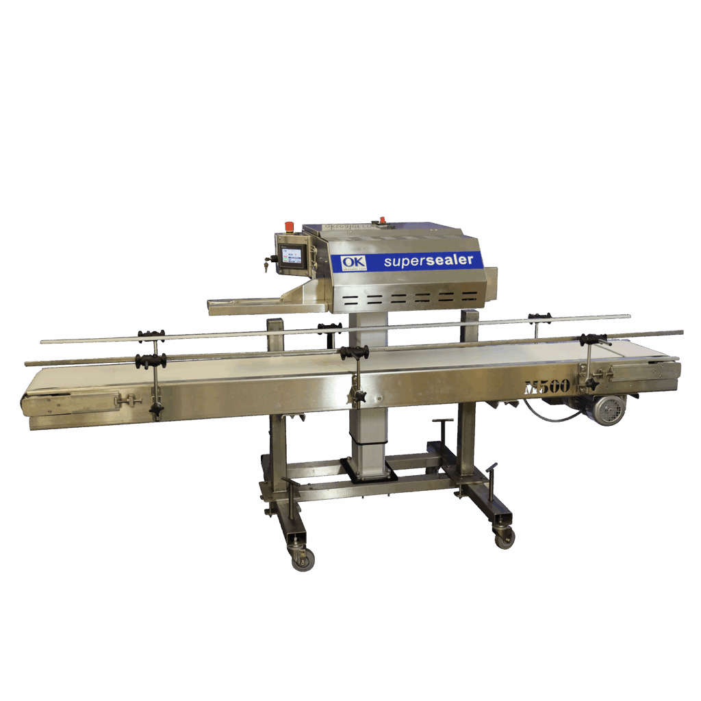 For heavy weight applications, we offer the Supersealer SS2 Hot Air Sealer or Supersealer SB20 Band Sealer with a standard motorized aluminum pedestal, stainless steel base, casters with lock down pads and M500 support conveyor.